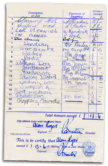 Bob a Job Week began in 1949, for one week a year in April, all Scout groups across Britain ‘hired out’ their Scouts and Cubs for “Bob-a-Job week”, issuing them with job cards and instructions to go round to local homes, knock on strangers’ doors and ask for any small jobs the householder needed doing But it was abolished in 1992 due to health and safety rules.