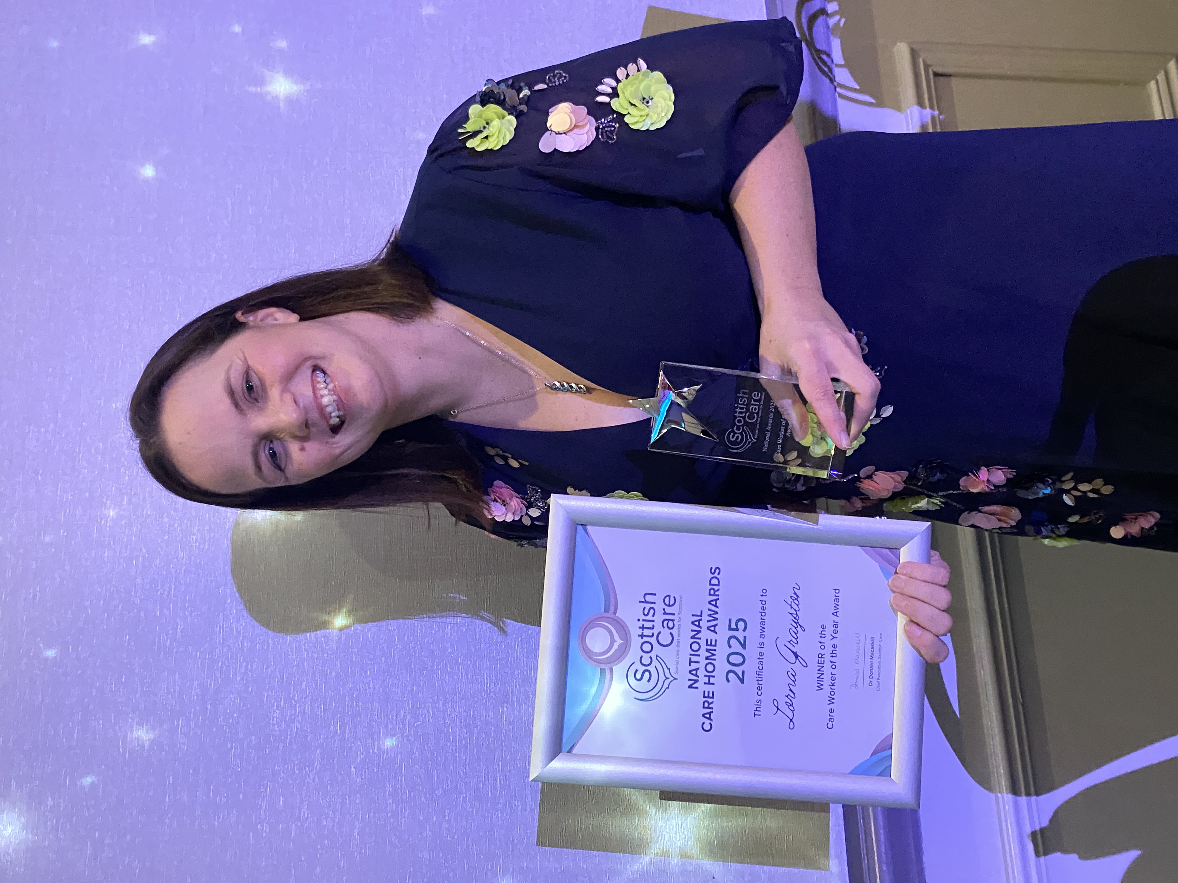 To the delight of the entire Erskine team, Lorna, from Stevenson and a member of staff for 15 years, was announced as the winner of the Care Worker of the Year award — an outstanding achievement.