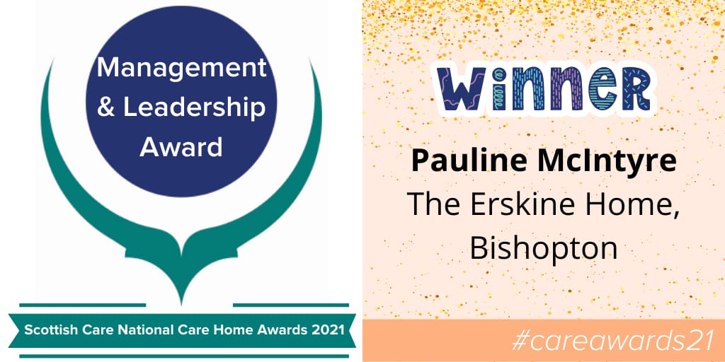 He continued: “While we work as a team, wrapped round the care of our residents, it is good to stop occasionally and recognise the exceptional contribution of an individual, and that is what the Management and Leadership Award gives us the opportunity to do. The award recognises Pauline’s individual contribution, effort and the expertise she brings every single day to her work here at Erskine and in her contribution to the national agenda. We are very proud of Pauline and the achievements leading to her winning this prestigious award, made even more meaningful coming from peers across the Scottish Care Home sector.“