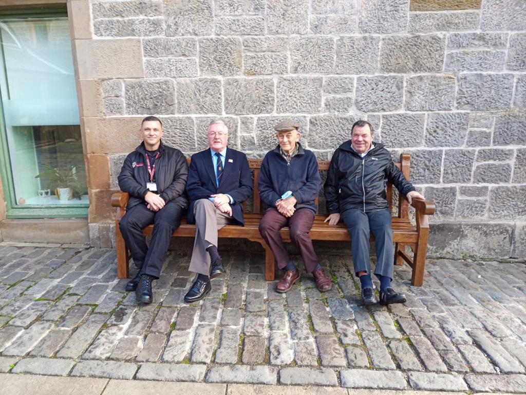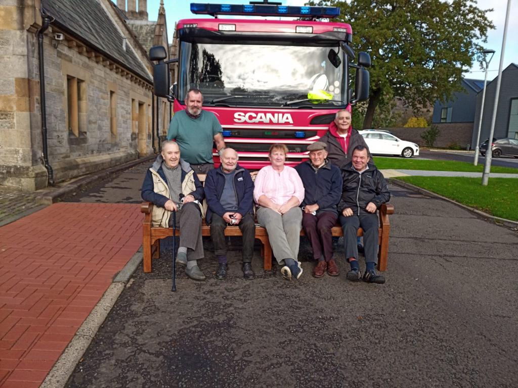 Once the bench was fully restored, the Veterans involved invited those in the Fire Brigade to come to its unveiling. Friday 22 October saw Stuart, the crew from Renfrew FRS and Graeme attending ERMAC to view the restored bench and to meet the restoration team, made up of Veterans Joyce Mann, George Collins, Roy Smart and John McAndrew.