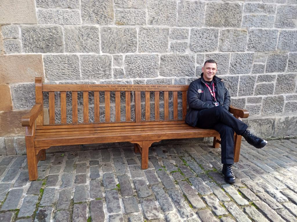 The bench had been located outside the old garden centre building for a prolonged period of time, possibly years, and was showing signs of needing some quality TLC. Structurally this was a solid bench with no signs of physical damage, but it was in a fairly sorry state. Our Veterans contacted Station Commander Stuart Murdoch, Strathclyde Fire and Rescue and former Firemen Graeme Kirkwood and James ‘Jim’ Smith to find out more about the bench.